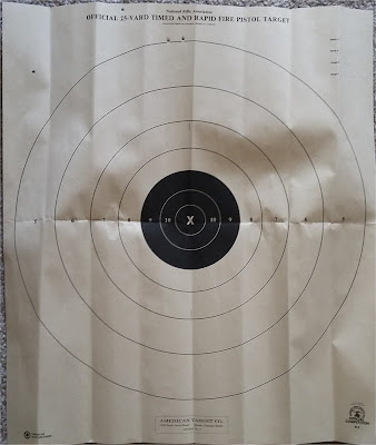 Was able to get 16 shots before it got too hot at the range (AZ). Shoots a bit high. The barrel is so-so, either it's me or the barrel is not good for muzzle loading applications, too fast of a spin. Groups of 2 to 3 inches at 25 yards seem to be normal. This grouping is with 10gr of Goex FFFG, NAA bullets and some or no lube. Cleaning with a brass brush after each shot seems to be required. Using less than 10gr of Goex doesn't seem to help accuracy. It's a bit of a pain to load 10gr of BP from a large horn, spilling more than used.